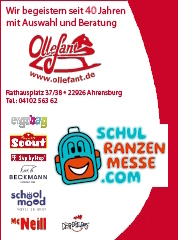 Neben dem Bett! Viele Erstklässler haben auf Schulranzenmessen den passenden Ranzen gefunden. Und das heißt, er sitzt perfekt auf dem Rücken und gefällt. Seit Jahren veranstaltet der Schulranzenprofi Ollefant Messen in Hamburg und Umgebung. Damit ist das Kinderfachgeschäft weit über die Grenzen Ahrensburgs bekannt. Denn Auswahl und Kompetenz sind zum Markenzeichen geworden. Sowohl auf Messen als auch im Ladengeschäft erhalten sie Sonderkonditionen